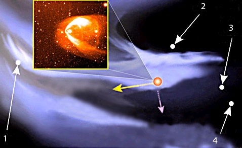 Ближайшее окружение Солнца (масштаб не соблюдён). Красным кружком показана гелиосфера, жёлтой стрелкой - направление её движения, розовой стрелкой - направление движения локального межзвёздного облака, в основном состоящего из водорода. 1 - Альтаир, 2 - Альфа Центавра, 3 - Сириус, 4 - Процион. Несовпадение направлений перемещения Солнца и облака как раз и создаёт ударную волну, искажающую гелиосферу (иллюстрация с сайта swri.edu).